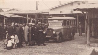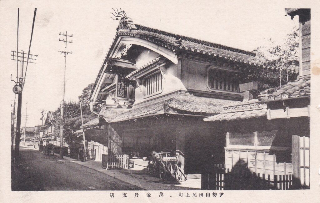 昭和初期に発行された絵はがき「伊勢山田尾上町 萬金丹支店」の画像です。実際の画像を見ますと威風堂々とした建物で、鬼瓦からは飾りのようなものが突き出しています。