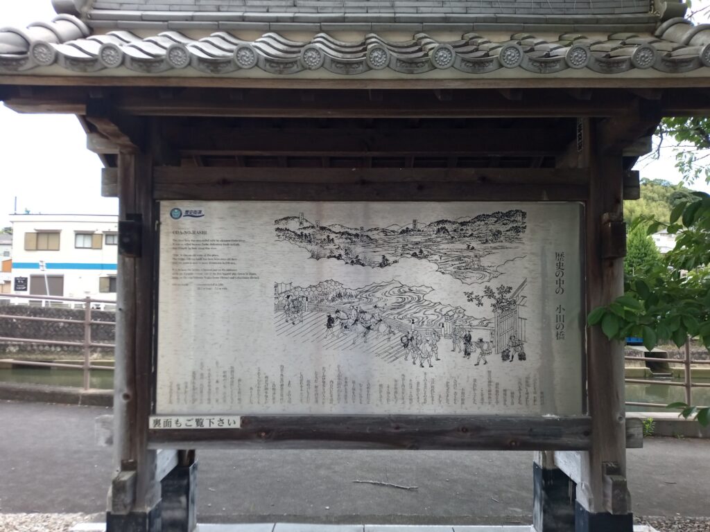 岡本側に設置されている小田橋の説明看板の画像です。昔の小田橋の絵図も彫られています。