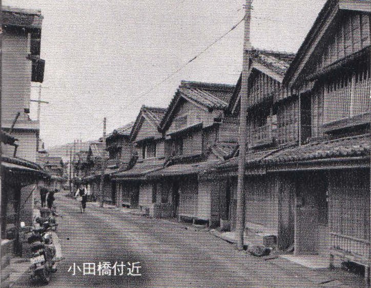 昭和37年(1962年)12月に近畿日本鉄道宣伝部から発行された「近鉄沿線風物詩 社会7 参宮街道」に掲載されている「いまの小田橋」の画像です。勢田川は昭和49年(1974年)の七夕災害の実情から、昭和51年から河川改修事業が行われ現在のようになりました。