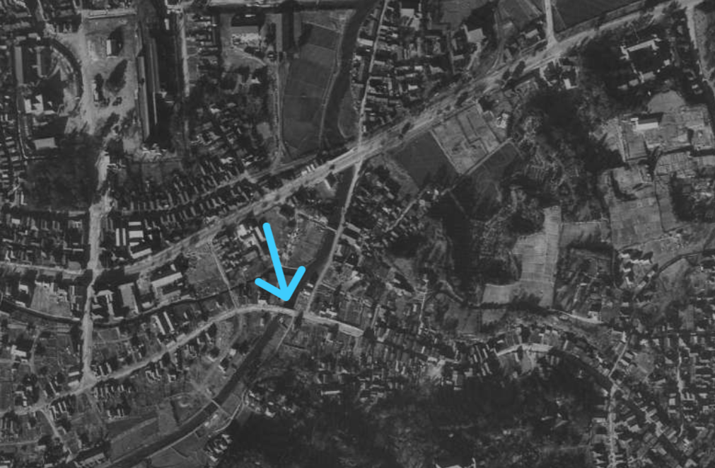 国土地理院にある昭和23年(1948年)12月に撮影された尾上町付近の空中写真の画像です。水色の矢印の先が小田橋になり、萬金丹支店の辺りはこの時点でも更地のままのように見えます。この時代、なかなか復興は進まなかったようですね。