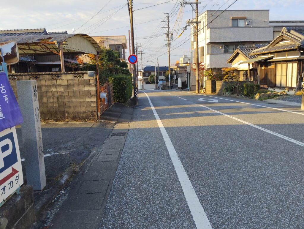 上の画像と同じ角度で撮影した現在の画像です。備前屋跡の石柱があるのみで、当時の面影はありません。