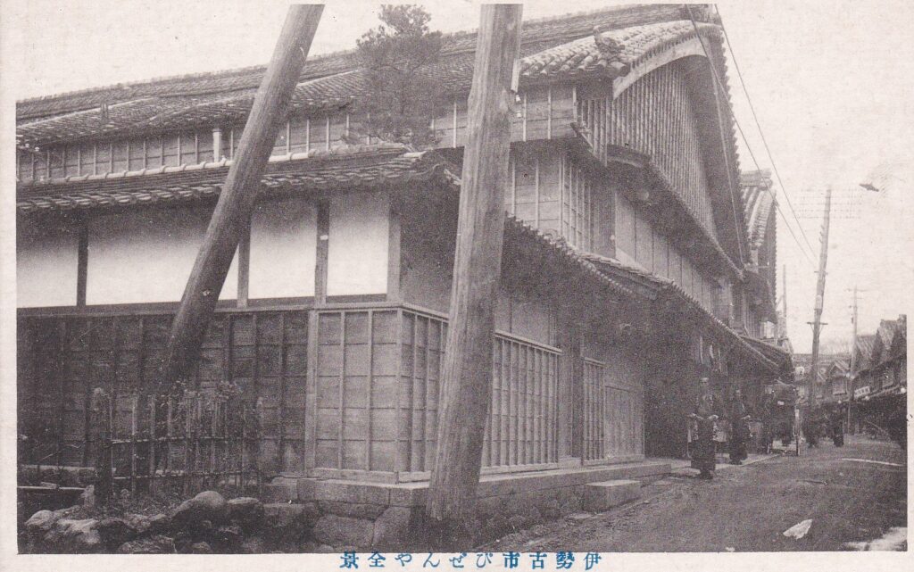 大正7年以降に発行された「伊勢古市びぜんや全景」の画像です。立派な店構えです。
