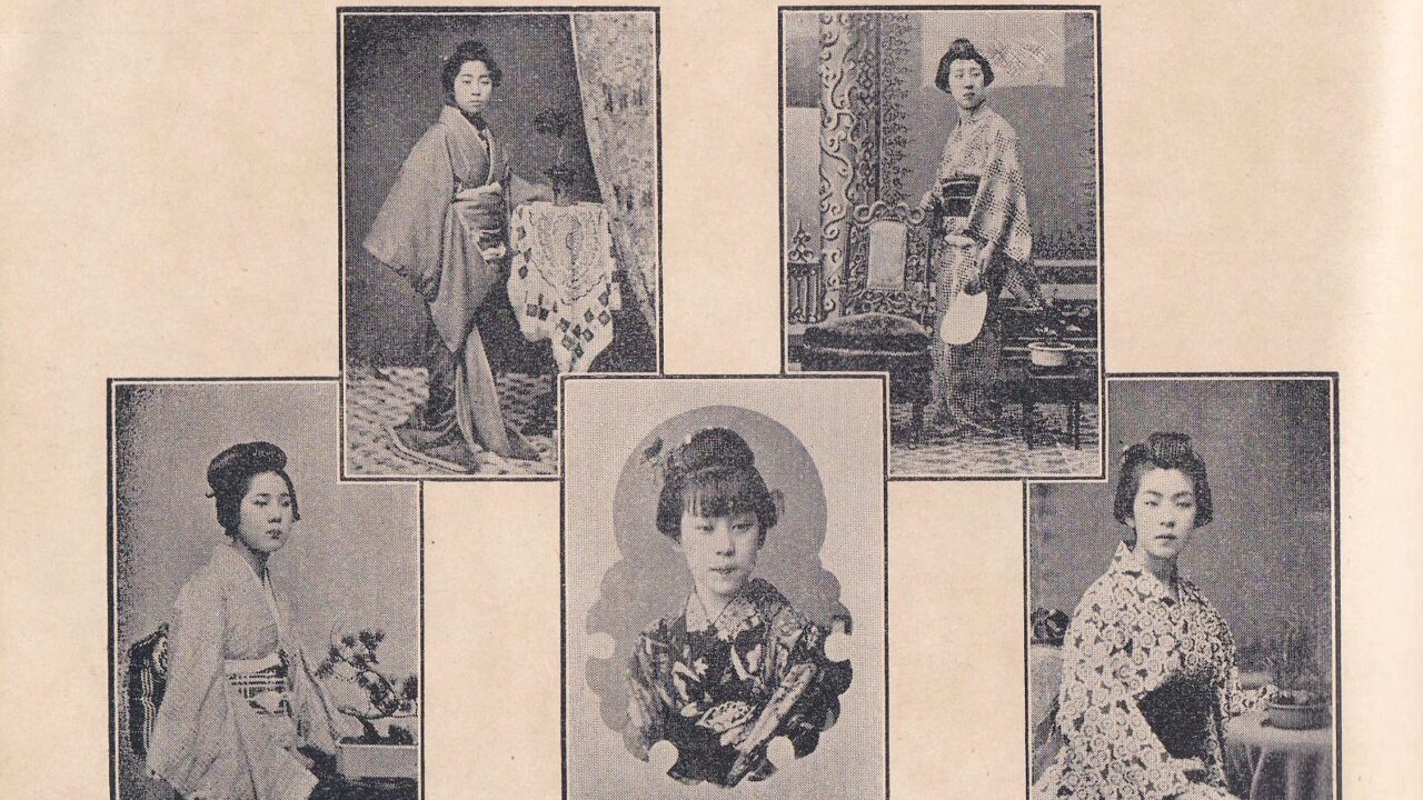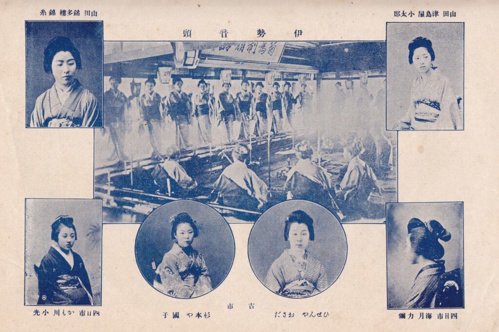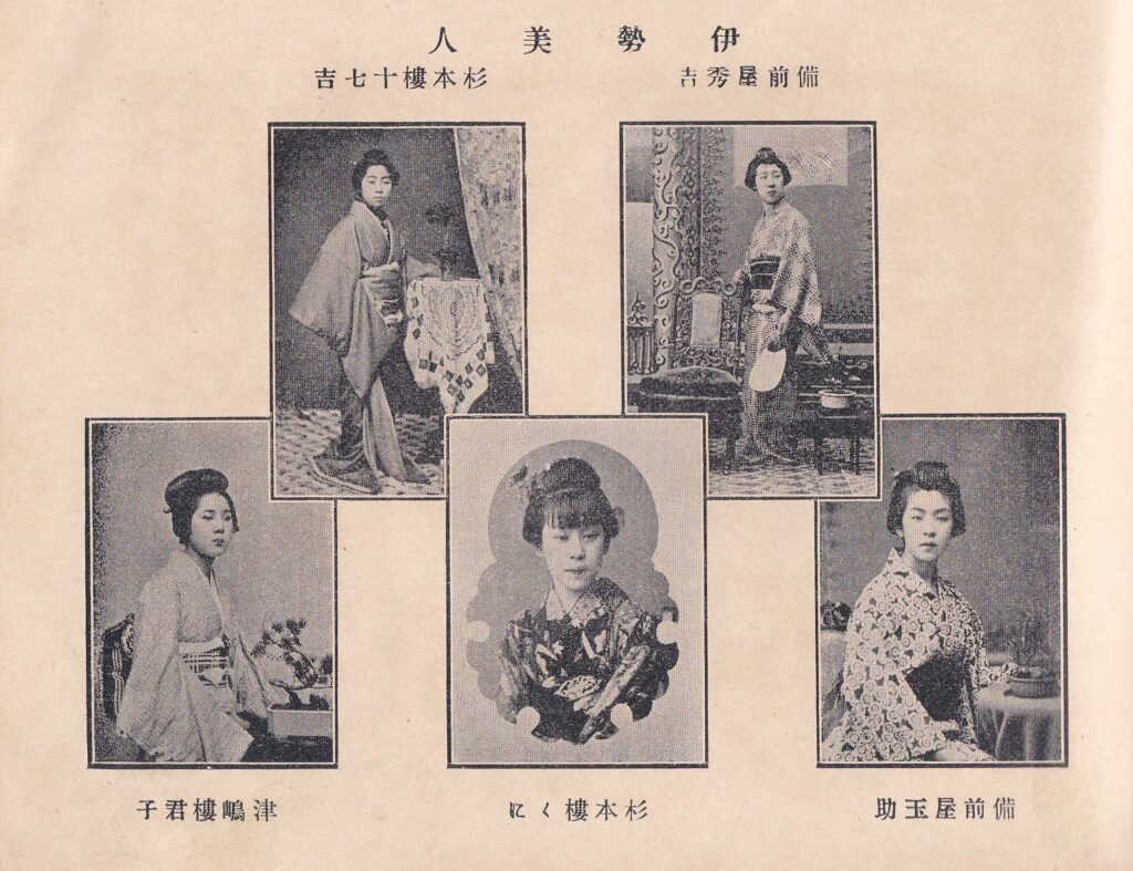 「伊勢たより参宮案内」に掲載されている「伊勢美人」の画像です。伊勢美人として2大遊郭の備前屋と杉本屋の娼妓が二人ずつ、津嶋楼が一人が写っています。浮世絵・錦絵では同じような顔に見えますが、写真ですとそれぞれの個性がでていますね。