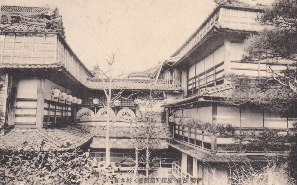 大正7年以前に発行された絵はがき「伊勢古市旅館(菊寿楼)杉本屋」の画像です。「伊勢古市考」ではまだ華やかだった頃の画像になります。